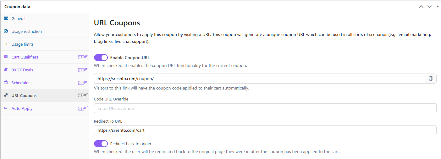 Turn links into instant discounts. Share a special URL that applies a coupon as soon as a customer clicks it. ideal for email campaigns, social media, or ads.